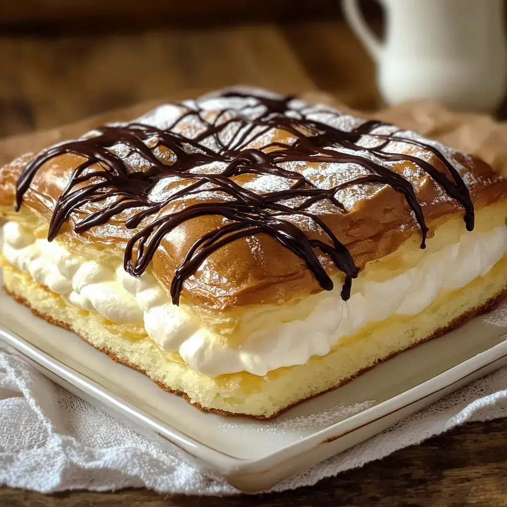 Este pastel combina lo mejor de los clásicos con un giro moderno. La base es una deliciosa masa choux al horno, encima va un relleno suave de pudín con queso crema, y se culmina con crema batida y un chorrito de chocolate.